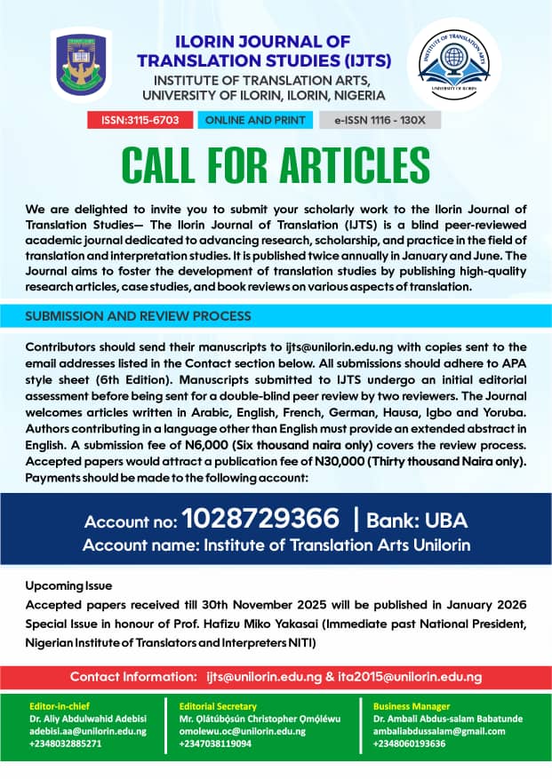 We are delighted to invite you to submit your scholarly work to the Ilorin Journal of Translation Studies- The Ilorin Journal of Translation (IJTS) is a bind peer-reviewed academic journal dedicated to advancing research, scholarship, and practice in the field of translation and interpretation studies. It is published twice annualy in January and June. The Journal aims to foster the development of translation studies by publishing high-quality research articles, case studies, and book reviews on various aspects of translation.